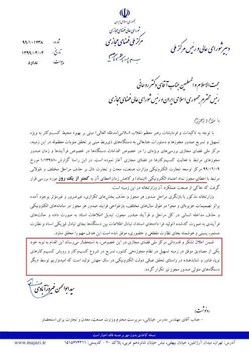 معاون مرکز توسعه تجارت الکترونیکی وزارت صمت تصریح کرد: این اقدامات در سال ۱۳۹۹ توسط مرکز ملی فضای مجازی به عنوان الگوی موفق تسهیل در نظام مجوزدهی،تسریع در شروع کسبوکار و رویش کسبوکارهای نوپا، فناور و شتابدهنده در راستای تحقق عملی دولت الکترونیکی و جهش تولید معرفی شد.